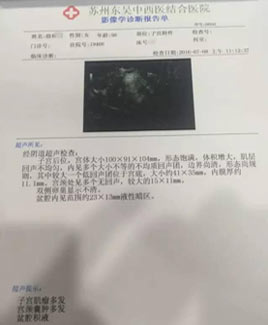7月8日上午,来自相城的殷女士在丈夫的陪同下来院检查,接诊的是妇科王正娟主任,据王主任介绍:“殷女士来院时已经出现腹部凸起,下腹部轻压疼痛的情况。”根据殷女士本人当时的阐述,她在12年前就已经查出了有2cm的小肌瘤,一开始并没有在意,但小肌瘤慢慢的随着时间逐渐变大,一年前已经出现经期延长、经量增多、伴头晕的情况,之前一直由于工作忙而没有时间,现在退休了就想着赶紧把这个肌瘤摘除。随后,王正娟主任就安排了殷女士做了B超检查,超声提示:子宫肌瘤多发、宫颈囊肿多发、盆腔积液。”