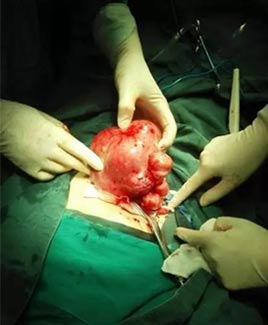 7月12日上午9时许,由金雁主任、曾志贤院长、朱雨云等医生为殷女士X行经腹子宫次全切除术,术中同时分离盆腔粘连,清楚盆腔内子宫内膜异位病灶。手术过程中,通过盆腔探查发现子宫呈不规则增大,凹凸不平、如孕3月余,质硬,子宫前壁、右壁、宫底、后壁分别出现3-6cm肌瘤共计十来个。可喜的是,因术前准备充分、术中处理得当,镜下缝合技术娴熟,整个手术历经1小时50分,子宫肌瘤终于被摘取。